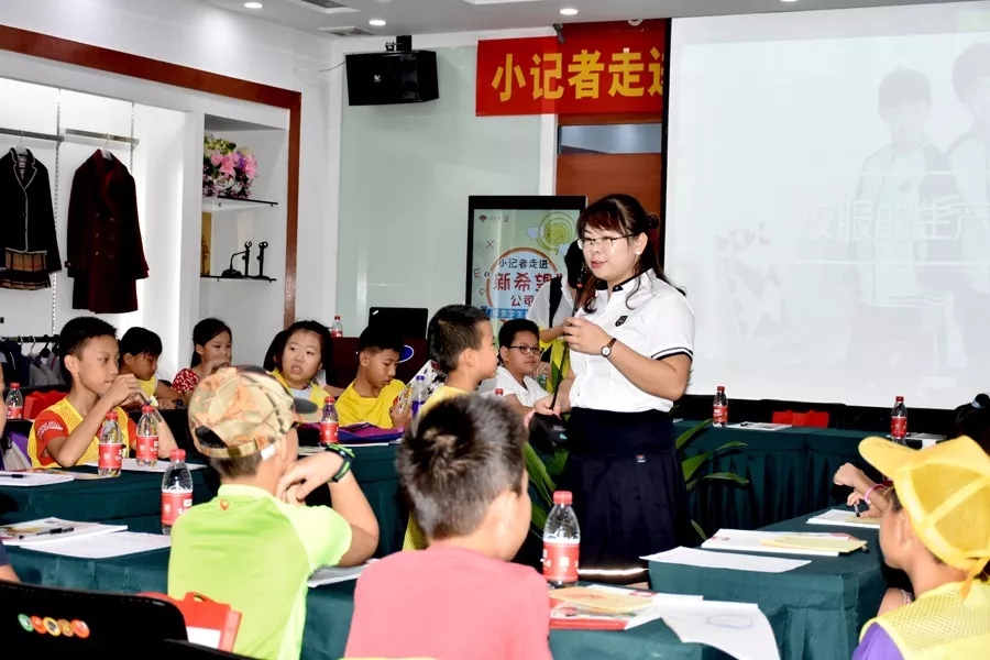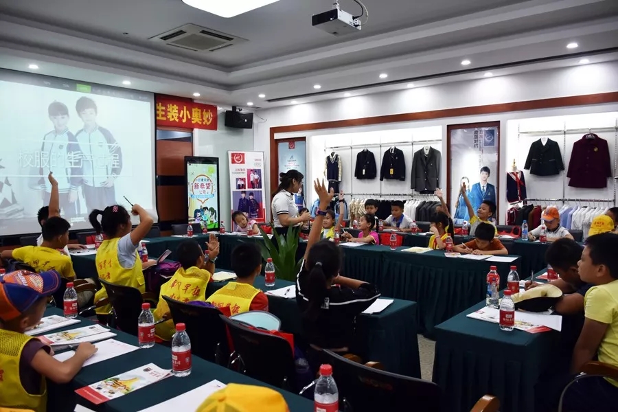 隨后,小記者們來到新希望學生裝生產企業(yè)百裕集團營銷中心,齊聚服裝展示廳共同深入探討學生裝知識。會上,小記者們共同觀看了“學生裝生產流程視頻”,并回顧往年“新希望”學生裝款式等內容。