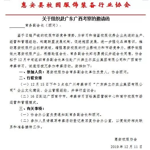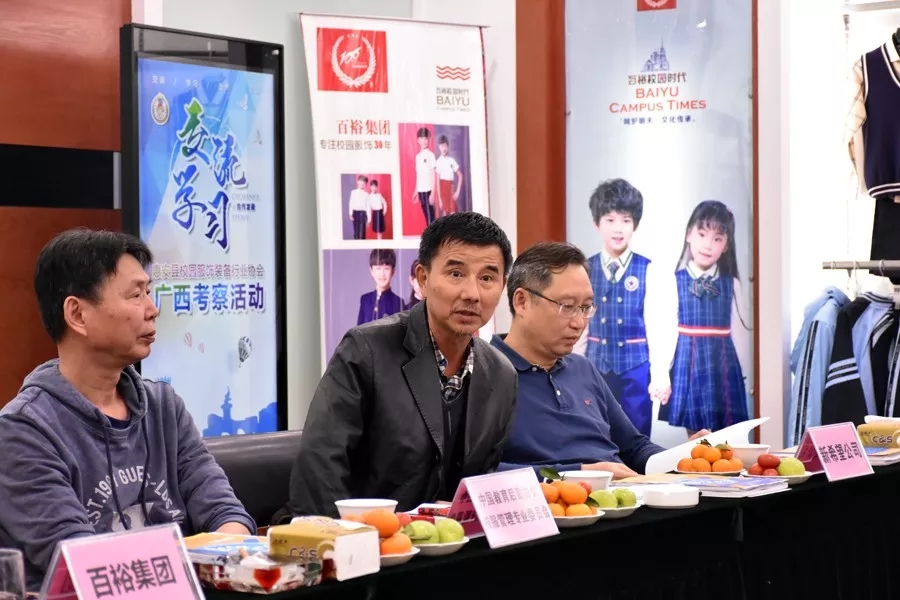 為學(xué)習(xí)和借鑒校服優(yōu)秀企業(yè)先進的生產(chǎn)、經(jīng)營和管理經(jīng)驗,構(gòu)建聯(lián)盟發(fā)展機制,促進企業(yè)抱團發(fā)展,進一步強化品牌意識,推動惠安校服行業(yè)創(chuàng)新突破,增強惠安校服的行業(yè)影響力和市場競爭力,攜手做強做大惠安校服產(chǎn)業(yè),12月15~17日,惠安縣校園服飾裝備行業(yè)協(xié)會會員單位赴廣東、廣西進行考察交流活動?;顒悠陂g先后考察廣東奔立爾集團、廣東雅藝服飾、百裕集團
