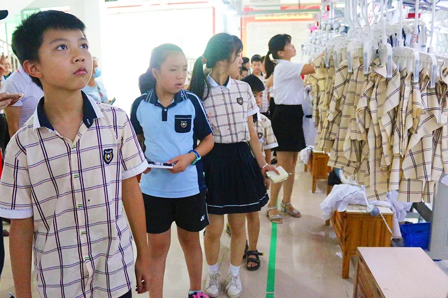 小記者們?cè)谏a(chǎn)中心工作人員的引領(lǐng)下,先后參觀了黨建中心、吊掛車間、裁剪車間、線下針織車間、全國學(xué)生裝文化展示中心、企業(yè)展示中心等。小記者們圍著解說員爭(zhēng)先恐后地提問,認(rèn)真地聆聽講解、仔細(xì)地觀察、記錄。解說員耐心地向小記者們?cè)敿?xì)介紹服裝的每一道工序,小記者們第一次這么近距離接近服裝生產(chǎn)線,一雙雙好奇的眼睛滿是欣喜,親眼見證了一件學(xué)生裝各個(gè)環(huán)節(jié)生產(chǎn)的過程,了解全國各地一些學(xué)生裝文件知識(shí)。