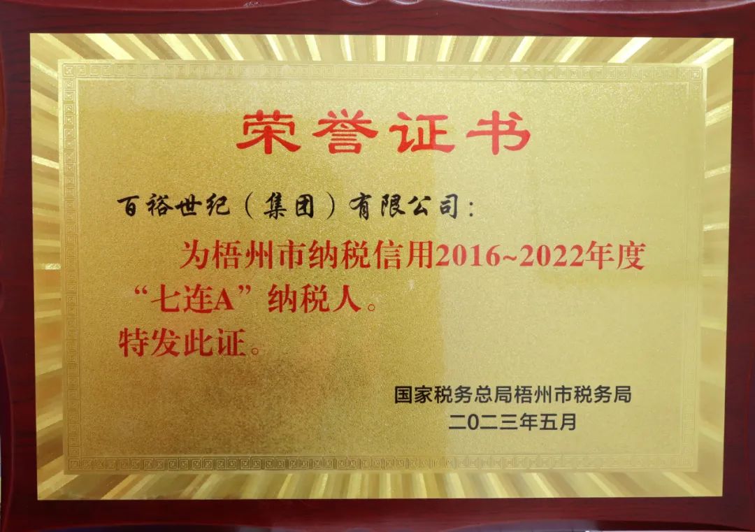 近日,經(jīng)國家稅務總局梧州市稅務局評審,百裕世紀(集團)有限公司被評為2016~2022年度“七連A”納稅人,這是我們堅持依法、誠信經(jīng)營的實質(zhì)成果。