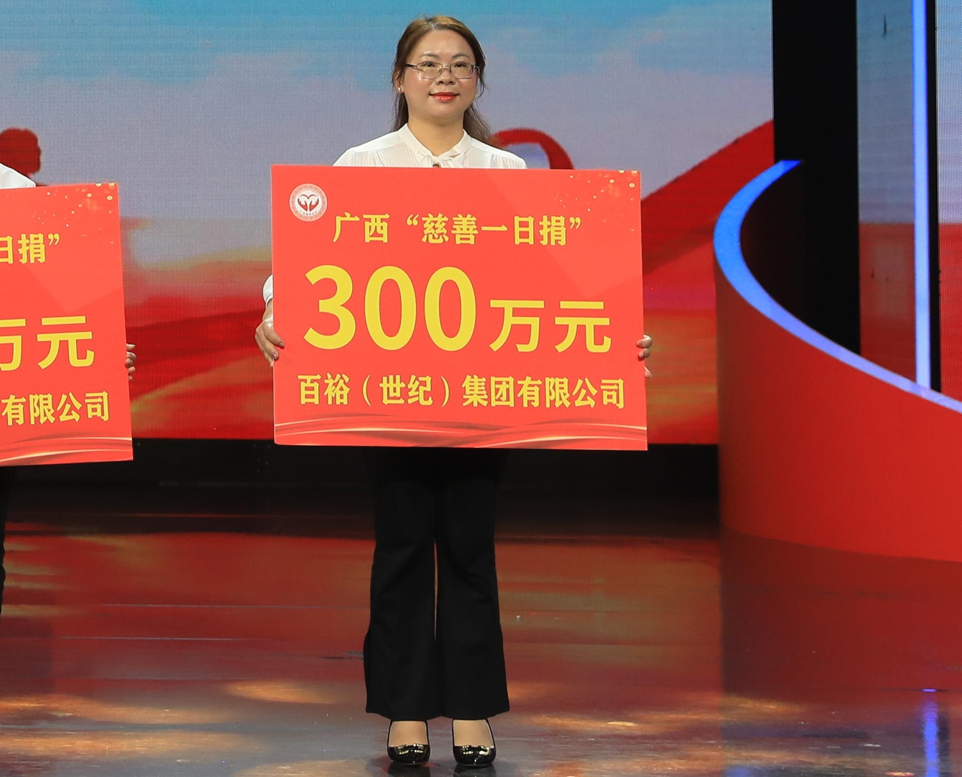 百裕世紀(jì)(集團(tuán))有限公司市場總監(jiān)曾凱蘭代表百裕集團(tuán)向廣西慈善總會(huì)舉牌捐款300萬元,以實(shí)際行動(dòng)弘揚(yáng)中華民族傳統(tǒng)美德,弘揚(yáng)大愛無疆的奉獻(xiàn)精神,詮釋新時(shí)代民營企業(yè)的使命擔(dān)當(dāng),為慈善事業(yè)貢獻(xiàn)自己的力量。