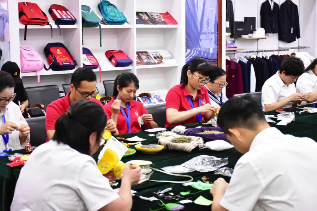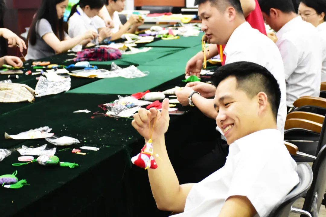 整個(gè)活動(dòng)現(xiàn)場(chǎng)祥和喜樂,大家熱情高漲。伴隨著歡聲笑語(yǔ),活動(dòng)步入了尾聲,一個(gè)個(gè)精致的荷包出現(xiàn)在大家的手中,大家競(jìng)相展示成果,分享喜悅,佩戴香囊合影留念。