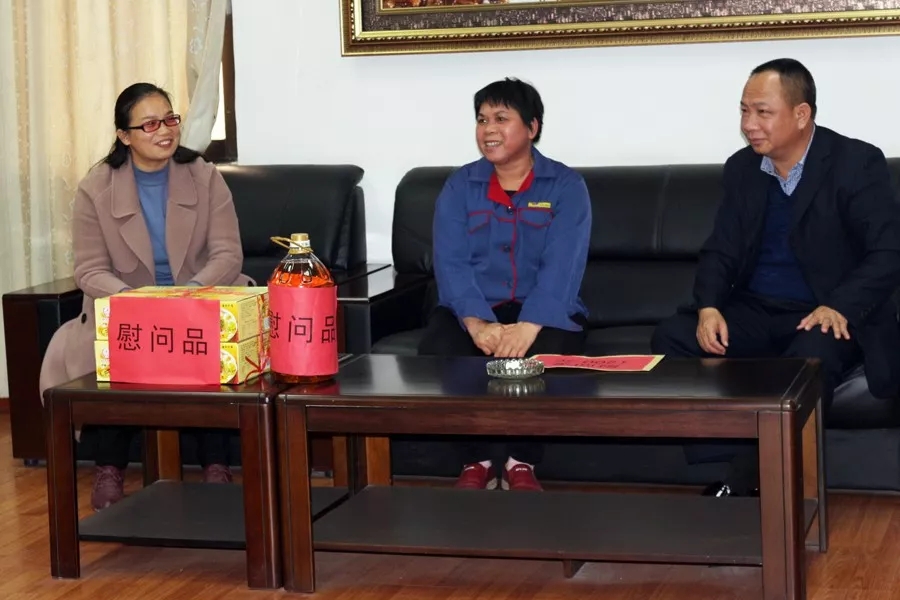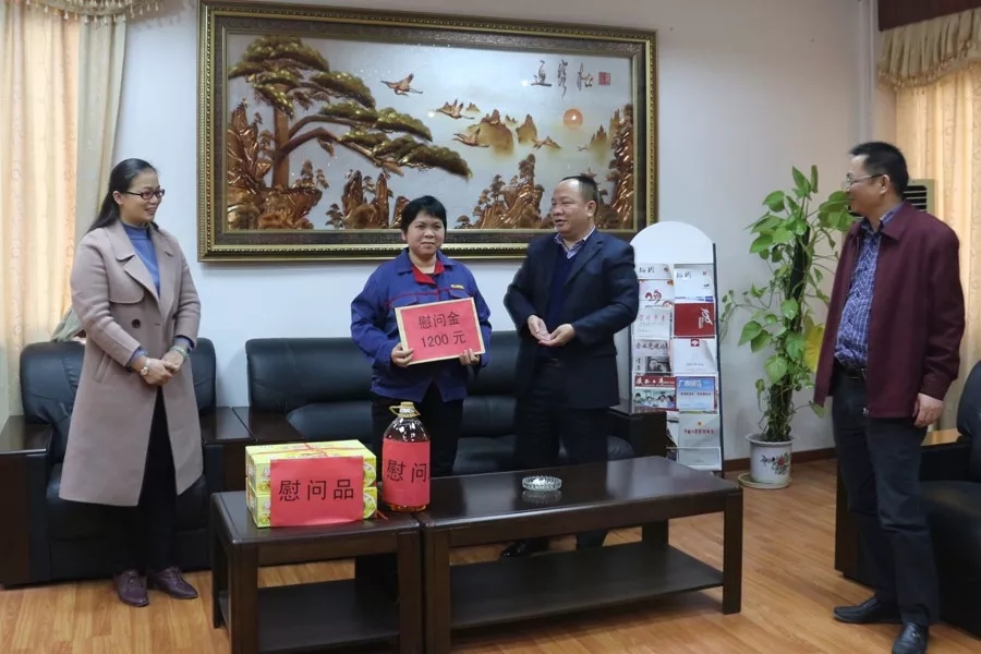 企業(yè)的發(fā)展離不開基層職工的辛勤付出,同月29日,廣西梧州市百裕實業(yè)有限公司常務(wù)副總經(jīng)理謝移植、岑溪生產(chǎn)廠廠長王平志一行先后走訪黃旭群等困難職工,為職工們送去春節(jié)禮品,并轉(zhuǎn)達了公司對職工的深切問候和美好祝福。
